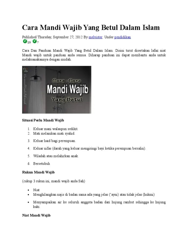 Kami Anak Islam Tata Caranya Niat Mandi Wajib from imgv2-1-f.scribdassets.com Tetapi dalam mandi wajib ini hanya di lakukan karena sebab tertentu misalnya setelah melakukan aktivitas suami istri seperti malam pertama, karena keluarnya air mani. Sementara, niat mandi junub untuk wanita setelah selesai haid atau nifas adalah sebagai berikut. Pasalnya, seorang muslim harus bisa membersihkan atau menyucikan diri mereka dari hadas besar. Samada terkelur air mani, selepas bersetubuh atau selepas haid atau nifas, cara mandi wajib yang betul adalah sangat penting. Bimbingan yang betul amat penting supaya umat islam menurut perintah allah. You can choose the cara mandi wajib yang betul apk version that suits your phone, tablet, tv. Niat mandi wajib boleh dilakukan dalam bahasa melayu ataupun bahasa arab. Documents similar to cara mandi wajib yang betul dan sah.