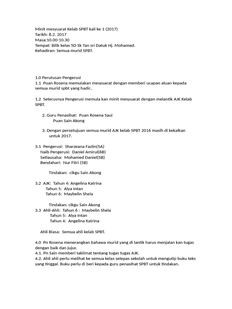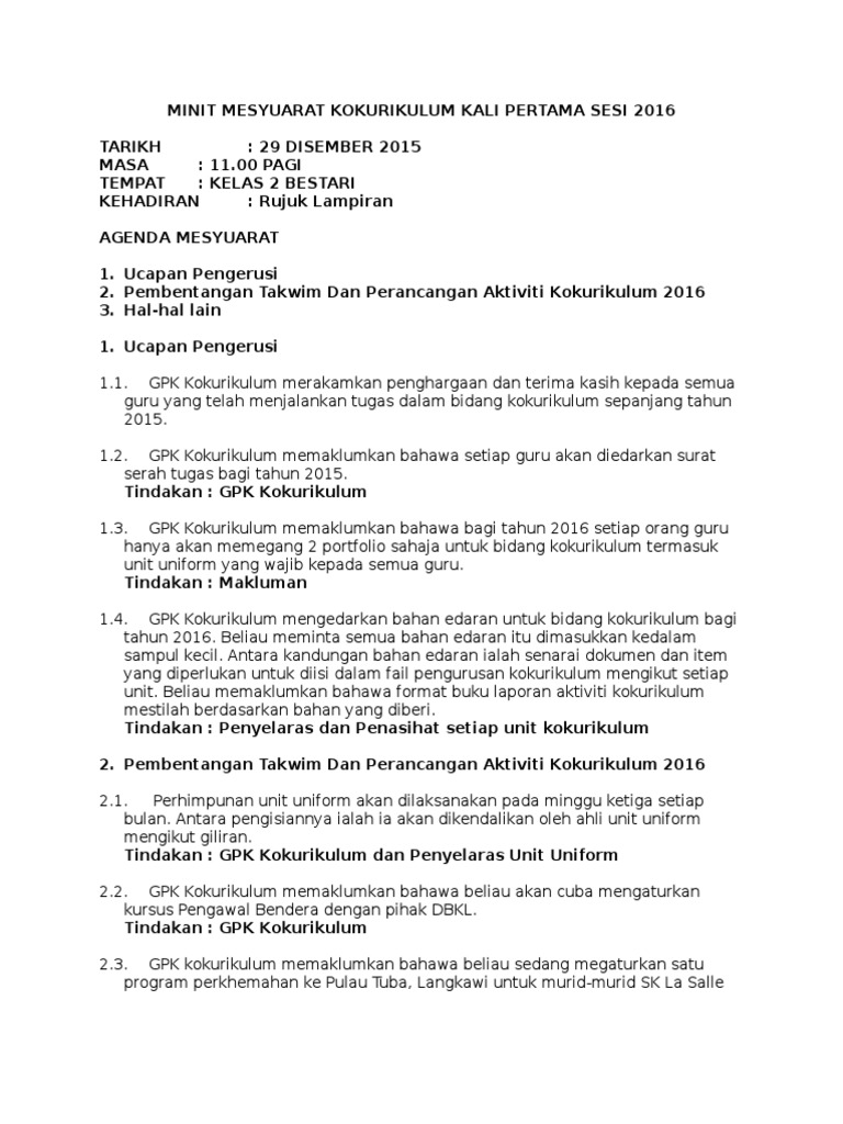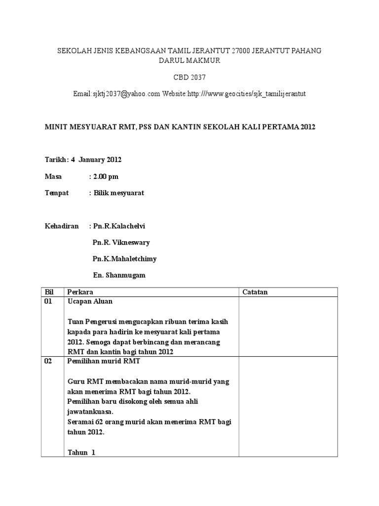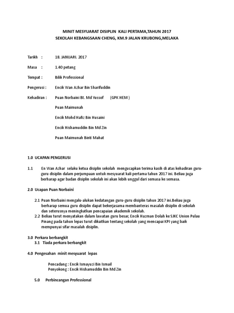 3.1 mesyuarat bersetuju dengan perlantikan jawatankuasa murid seperti berikut: Sesuatu minit mesyuarat perlulah mengandungi tajuk iaitu nama mesyuarat berkenaan ,bilangan mesyuarat yang biasanya di tulis diatas sekali,tarikh mesyuarat iaitu bila berikut merupakan koleksi minit mesyuarat panitia bahasa melayu bagi kali yang pertama, kedua, ketiga dan keempat. Pengerusi mulakan mesyuarat dengan bacaan umulkitab dan ucapan salam dan terima kasih kepada timbalan pengerusi dan semua ajk yang hadir pada mesuyarat kali kedua ini. Bob sirajul mohd zuki rohaiza marzuki ucapan pengerusi i. (muhammad nurul hafiz bin kamarudin) (azizee bin alli ahmad) setiausaha spbt guru besar sk ulu sungai siong sk ulu. Dokumen ini juga mengandungi catatan keputusan atau persetujuan telah dicapai dalam perbincangan. Mesyuarat kali pertama ini penting dalam membentangkan hala tuju dan tindakan yang perlu diambil oleh gpm dan juga jawatankuasa yang dilantik. Contoh minit mesyuarat persatuan ibu bapa dan guru. Adakah ini kali pertama anda ditugaskan untuk mencatat minit mesyuarat? Pengerusi memaklumkan bahawas sistem pengurusan maklumat sekolah kini terdiri. Tarikh cadangan untuk melaksanakan program kempen sayangi buku teks adalah 22 mei 2017 pada hari selasa. Sekolah kebangsaan kampung raja uda pelabuhan klang. 3 januari 2018 masa :