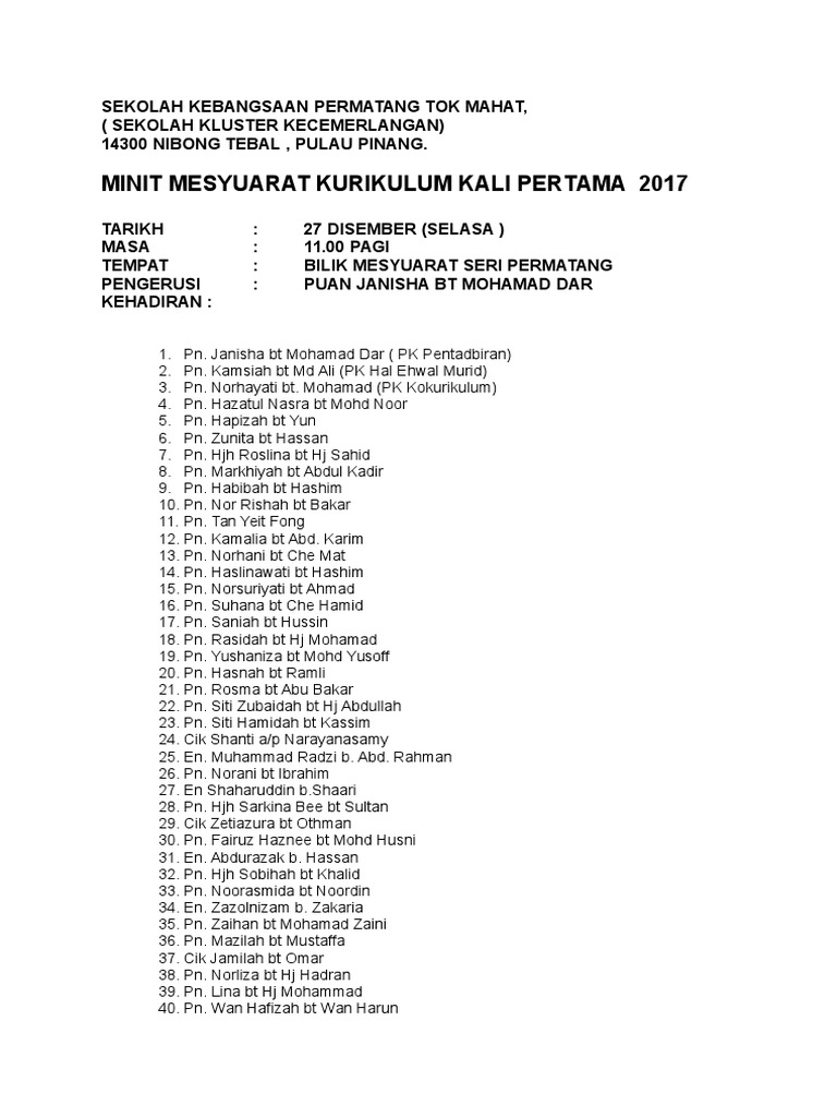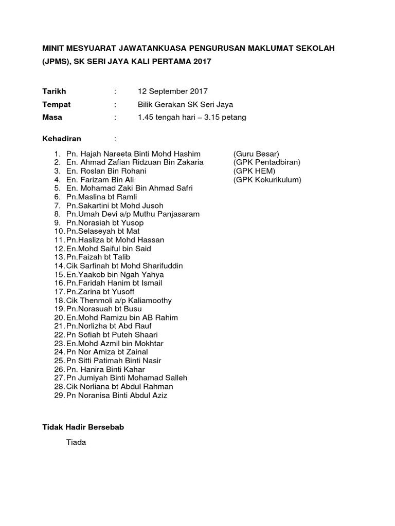 Rosni bt noran mengucapkan terima kasih di atas kerjasama yang diberikan oleh semua ahli jawatankuasa spbt dalam melancarkan dan melicinkan pengurusan buku teks sekolah. Minit mesyuarat panitia tmk kali kedua 2017. Minit mesyuarat panitia bahasa melayu kali pertama. Pengesahan minit mesyuarat minit mesyuarat jawatankuasa hem bil 2. Agenda mesyuarat adalah seperti berikut: